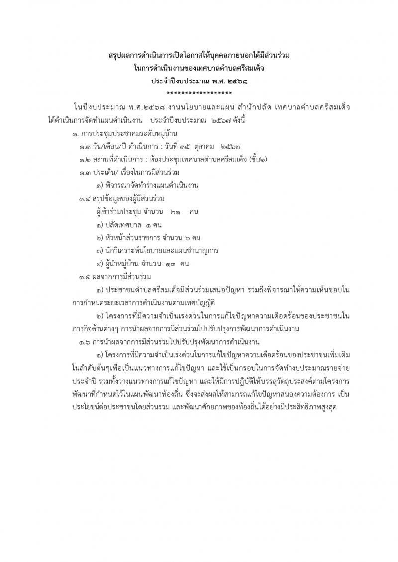 สรุปผลการดำเนินการเปิดโอกาสให้บุคคลภายนอกได้มีส่วนร่วม ในการดำเนินงานของเทศบาลตำบลศรีสมเด็จ ประจำปีงบประมาณ พ.ศ. 2568