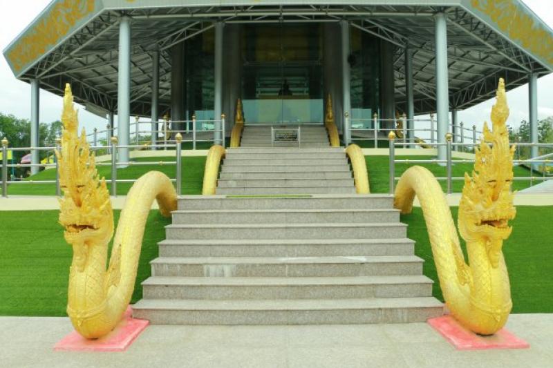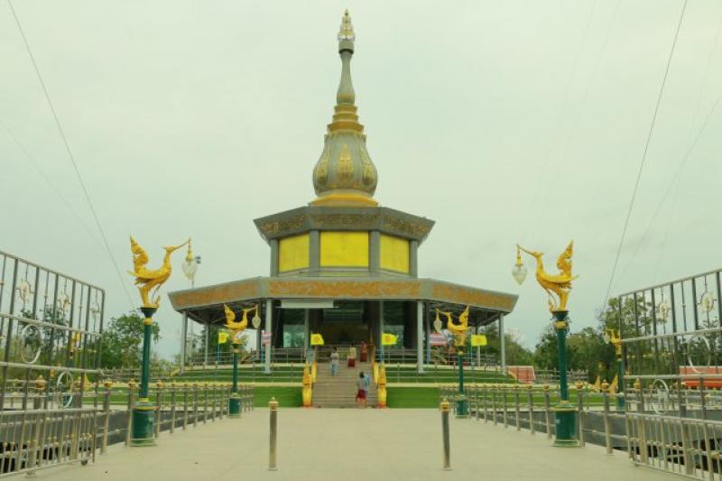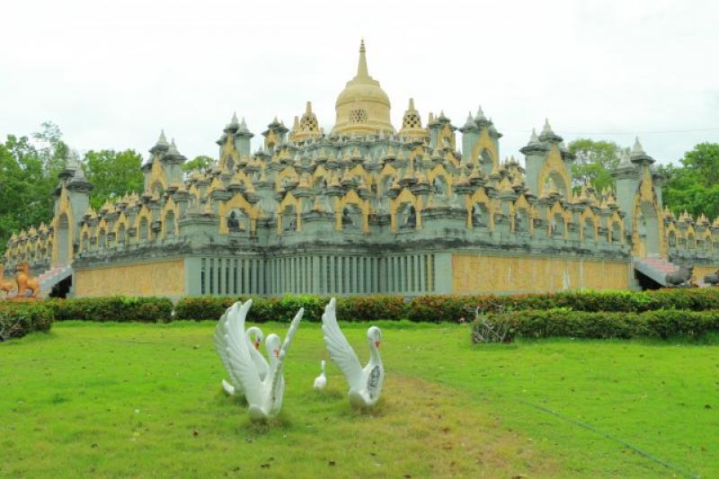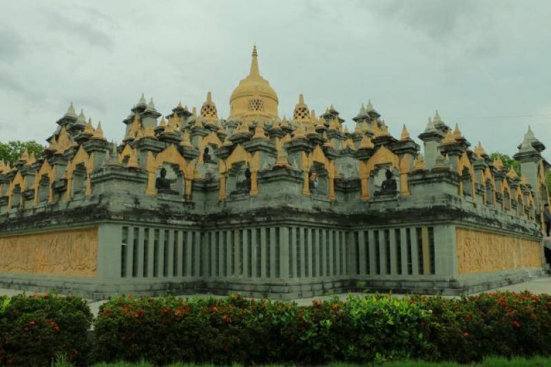 รายละเอียด : เจดีย์หินทราย วัดป่ากุง หรือวัดประชาคมวนาราม ตั้งอยู่ใน อ.ศรีสมเด็จ จ.ร้อยเอ็ด สิ่งมหัศจรรย์ที่สวยงามเป็นมีเจดีย์ขนาดใหญ่ ทำจากหินทรายธรรมชาติเป็นแห่งแรกในประเทศไทย นับเป็นแหล่งท่องเที่ยวทางศาสนสถานที่สวยงาม และยิ่งใหญ่ โดยจำลองแบบ การก่อสร้างมาจากบุโรพุทโธ ประเทศอินโดนีเซีย โดยก่อสร้างขึ้นเพื่อเป็นอนุสรณ์ครบรอบ 90 ปี พรรษา 60 ที่มาของการก่อสร้างเจดีย์หิน คราวเมื่อพระเดชพระคุณหลวงปู่ศรี มหาวีโร พระเกจิอาจารย์ฝ่ายกัมมัฏฐานชื่อดังแห่งภาคอีสานได้ไปปฏิบัติศาสนกิจจำพรรษาที่ ประเทศอินโดนีเซีย เมื่อ พ.ศ.2531 ได้ไปนมัสการเจดีย์โบโรโดร์(บรมพุทโธ) ที่เกาะชวาอินโดนีเซีย ได้เห็นความใหญ่โตมโหฬารงดงาม หลวงปู่เกิดความประทับใจมาก เมื่อกลับมาเมืองไทยก็ได้นำเรื่องราวที่ได้ไปพบมาเล่าให้ศิษยานุศิษย์ฟังและดำริว่าจะสร้างไว้ที่เมืองไทย ต่อมาในปี พ.ศ.2535 หลวงปู่ได้สั่งให้พระอาจารย์มานะอตุโลนำพระอาจารย์ศักดิ์ชัย อภิวัฒโนและนายอนุวัตร บูรณะกร(เป็ด) เดินทางไปดูรูปแบบเจดีย์โบโรโดร์(บรมพุทโธ) สถาปัตยกรรมชั้นนำ 1 ใน 7 ของโลก ซึ่งออกแบบสร้างสรรค์โดยช่างจากประเทศอินเดีย มีภาพแกะสลักที่แสดงถึงเหตุการณ์ต่างๆ ในสมัยพระพุทธองค์และแสดงเหตุการณ์เกี่ยวกับประวัติของพระพุทธเจ้าตั้งแต่ปางต่างๆ ในอดีตชาติ และภาพแกะสลักนูนสูง นูนต่ำที่แสดงตำนานทางศาสนาอย่างสมบูรณ์แบบด้วยฝีมือที่ประณีตละเอียดอ่อนมาก เพื่อนำมาเป็น แบบอย่างในการก่อสร้างเมื่อวันที่ 5 มีนาคม 2547 มหาเจดีย์หินทรายสร้างด้วยแรงศรัทธาของคณะศิษยานุศิษย์ เสียสละกำลังกาย กำลังทรัพย์ เพื่อเป็นอนุสรณ์แห่งความสมัครสมานสามัคคี เทิดทูนความดีที่หลวงปู่ศรีได้ประพฤติปฏิบัติและทำงานแข่งกับเวลาให้สำเร็จ เสร็จลงภายใน 2 ปี ซึ่งจัดพิธีสมโภชไปแล้วเมื่อวันที่ 3 พฤษภาคม 2549 ด้วยงบประมาณ 40 ล้านบาท