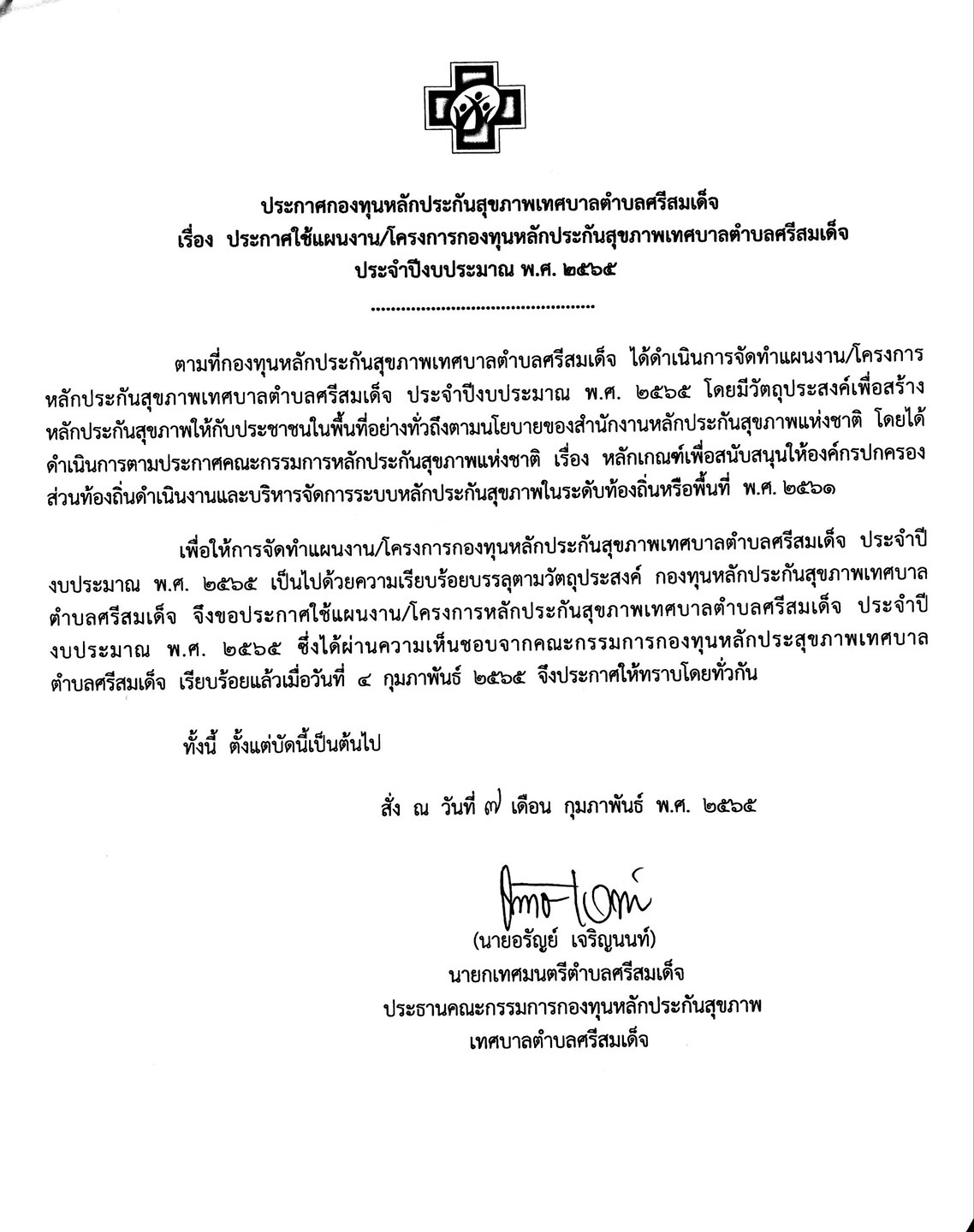 ประกาศใช้แผนงาน/โครงการกองทุนหลักประกันสุขภาพเทศบาลตำบลศรีสมเด็จ ประจำปีงบประมาณ พ.ศ.2565