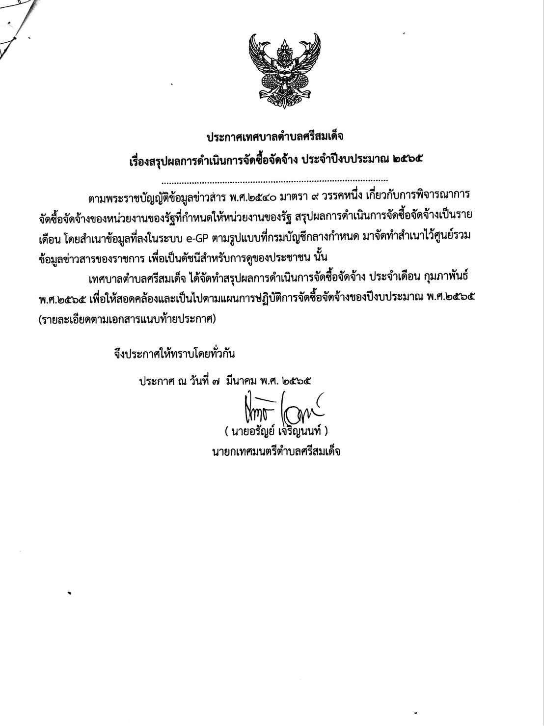 ประกาศเทศบาลตำบลศรีสมเด็จ เรื่อง สรุปผลการดำเนินการจัดซื้อจัดจ้าง ประจำเดือน กุมภาพันธ์ 2565