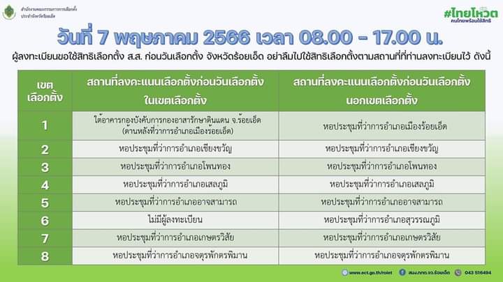 รายละเอียด : วันที่ 7 พฤษภาคม 2566 เวลา 08.00 -17.00 น. ผู้ลงทะเบียนขอใช้สิทธิเลือกตั้ง ส.ส. ก่อนวันเลือกตั้ง จังหวัดร้อยเอ็ด อย่าลืมไปใช้สิทธิเลือกตั้งตามสถานที่ ที่ท่านลงทะเบียนไว้ ดังนี้ค่ะ