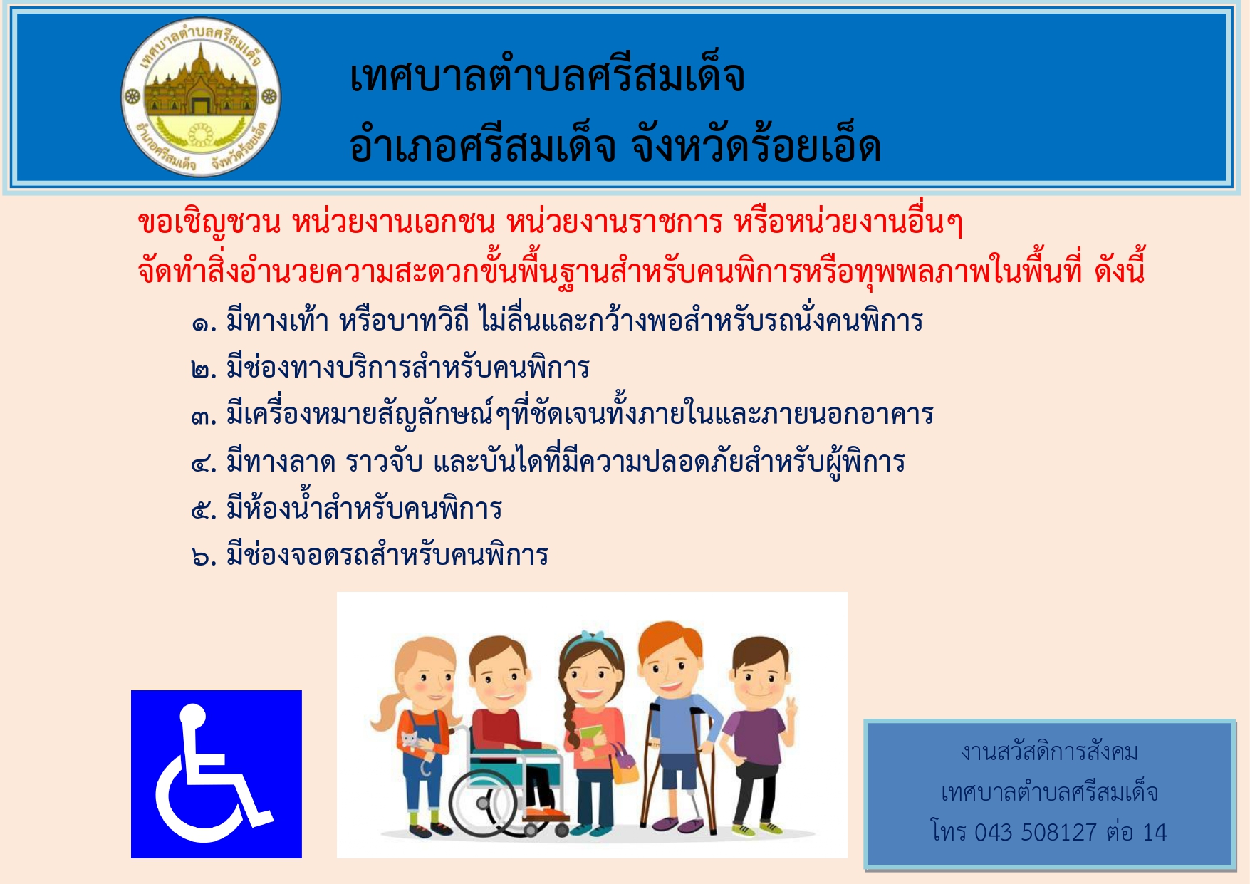 เชิญชวนหน่วยงานเอกชน หน่วยงานราชการ หรือหน่วยงานอื่นๆ จัดทำสิ่งอำนวยความสะดวกขั้นพื้นฐาน “สำหรับคนพิการหรือทุพพลภาพ” ในพื้นที่