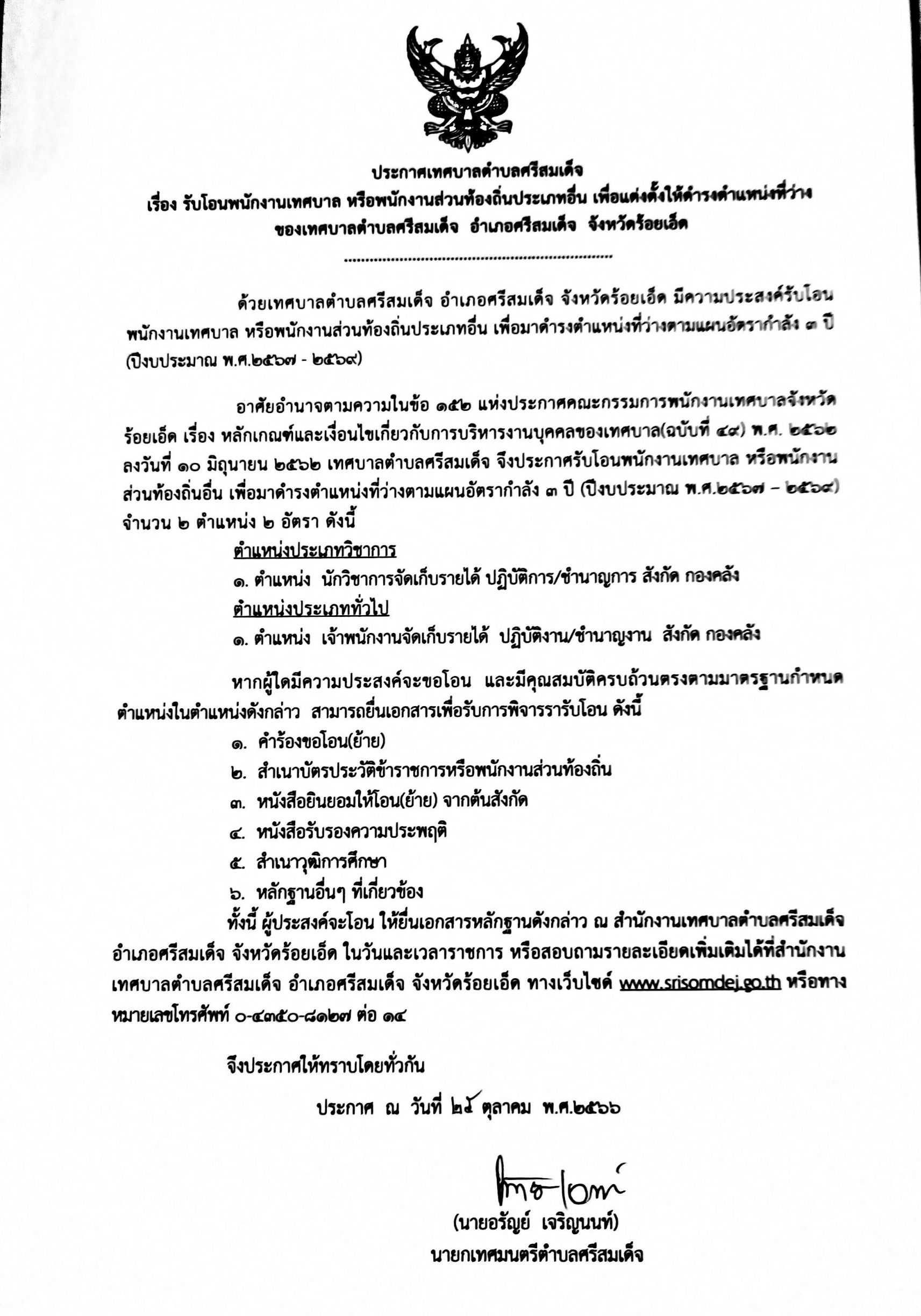 ประกาศรับโอนพนักงานเทศบาลหรือพนักงานส่วนท้องถิ่นเพื่อแต่งตั้งให้ดำรงตำแหน่งว่างของเทศบาลตำบลศรีสมเด็จ อำเภอศรีสมเด็จ จังหวัดร้อยเอ็ด