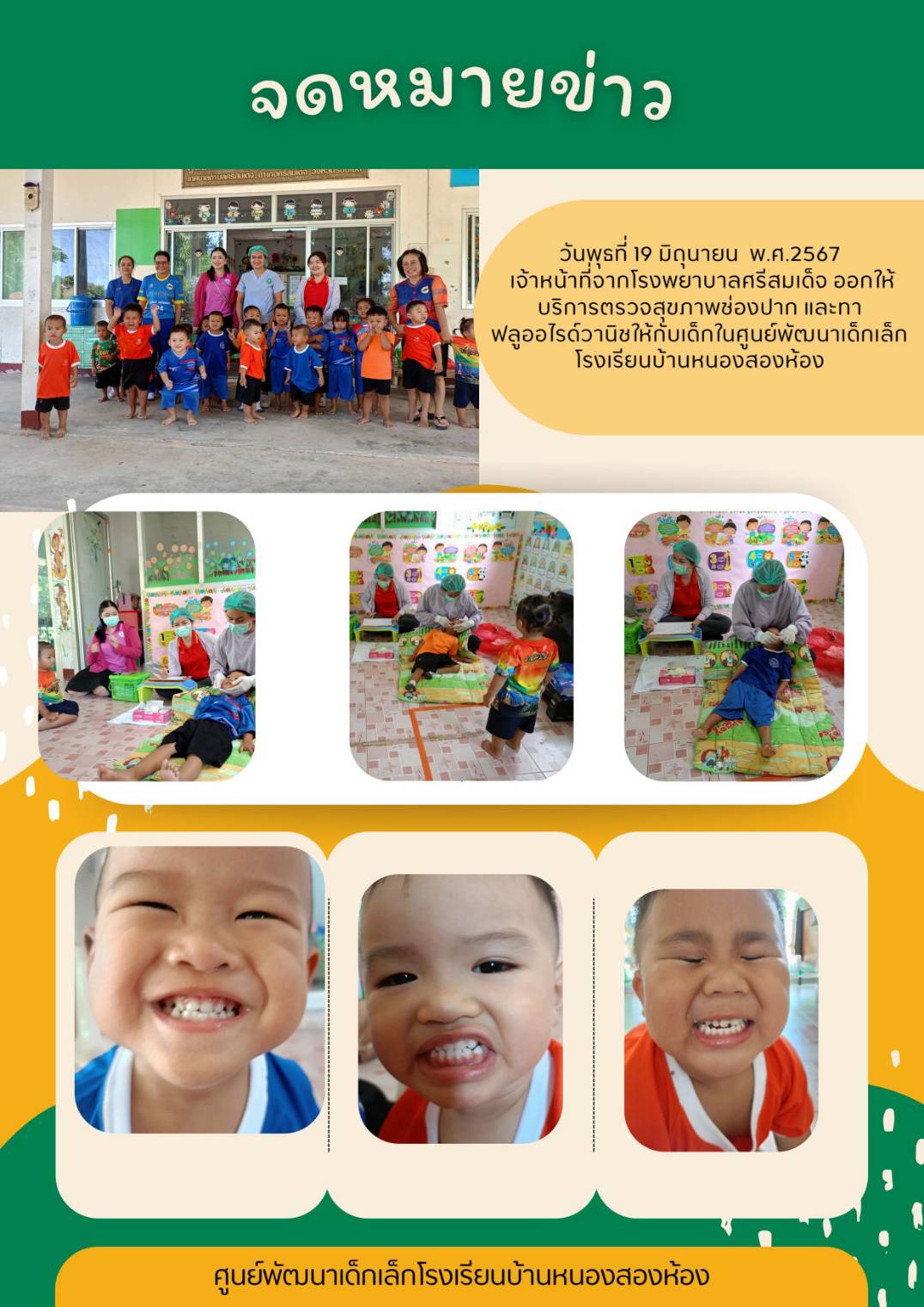 ตรวจสุขภาพช่องปากและทาฟลูออไรด์วานิชให้กับศูนย์พัฒนาเด็กเล็กบ้านหนองสองห้อง