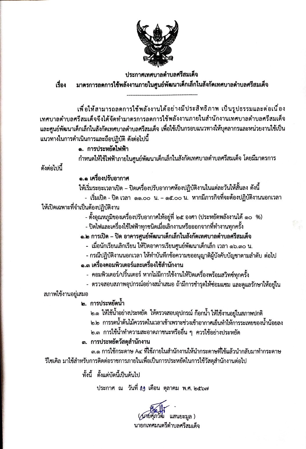 มาตรการลดการใช้พลังงานภายในศูนย์พัฒนาเด็กเล็กในสังกัดเทศบาลตำบลศรีสมเด็จ